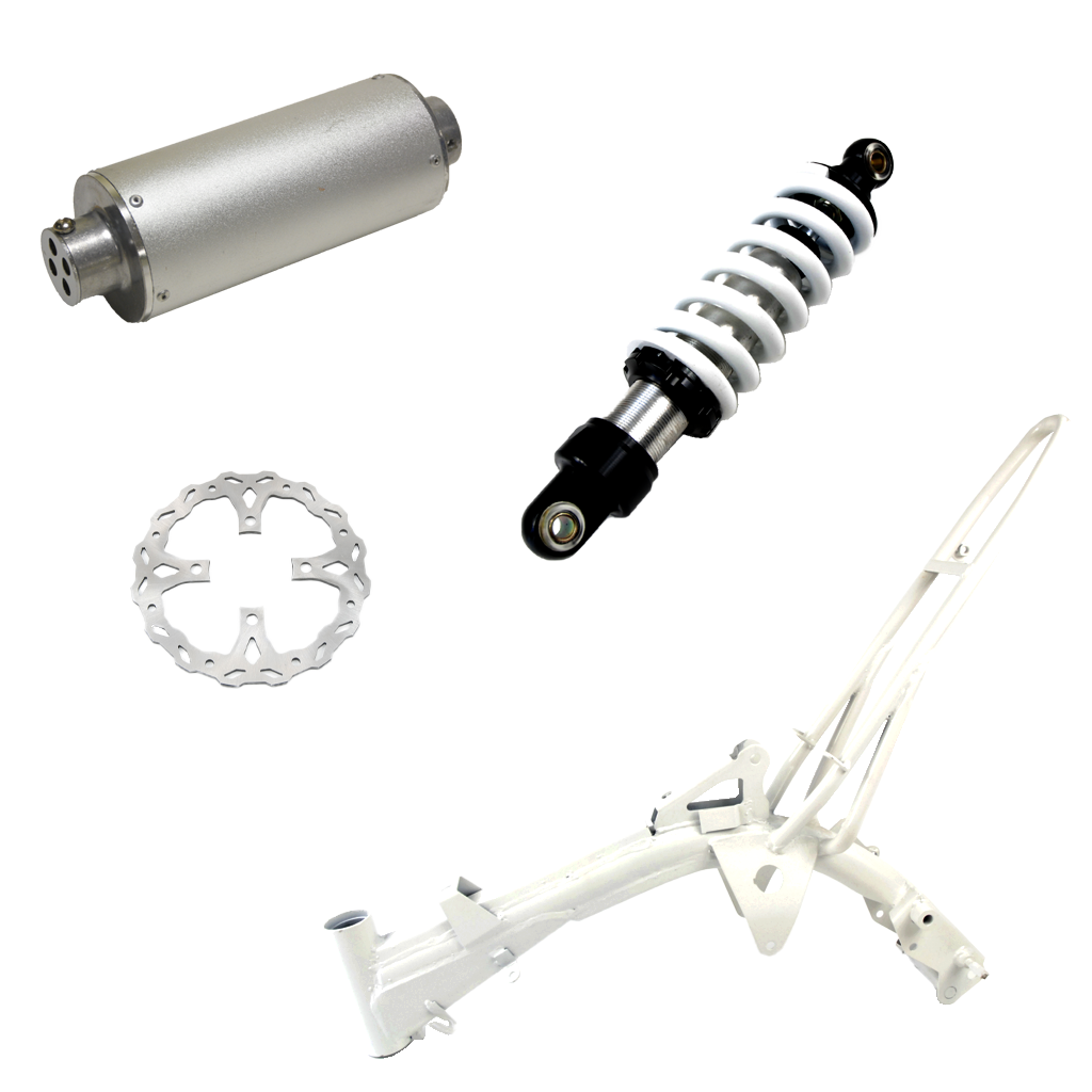 Les suspensions ne sont pas en reste avec l’ajout d’une fourche inversée en aluminium et d’un amortisseur White Spring de 265 mm, réglable en précontrainte. Ces caractéristiques garantissent une excellente liaison au sol, permettant au jeune pilote de ce pit bike de profiter pleinement de ses sessions de conduite en toute sécurité.
